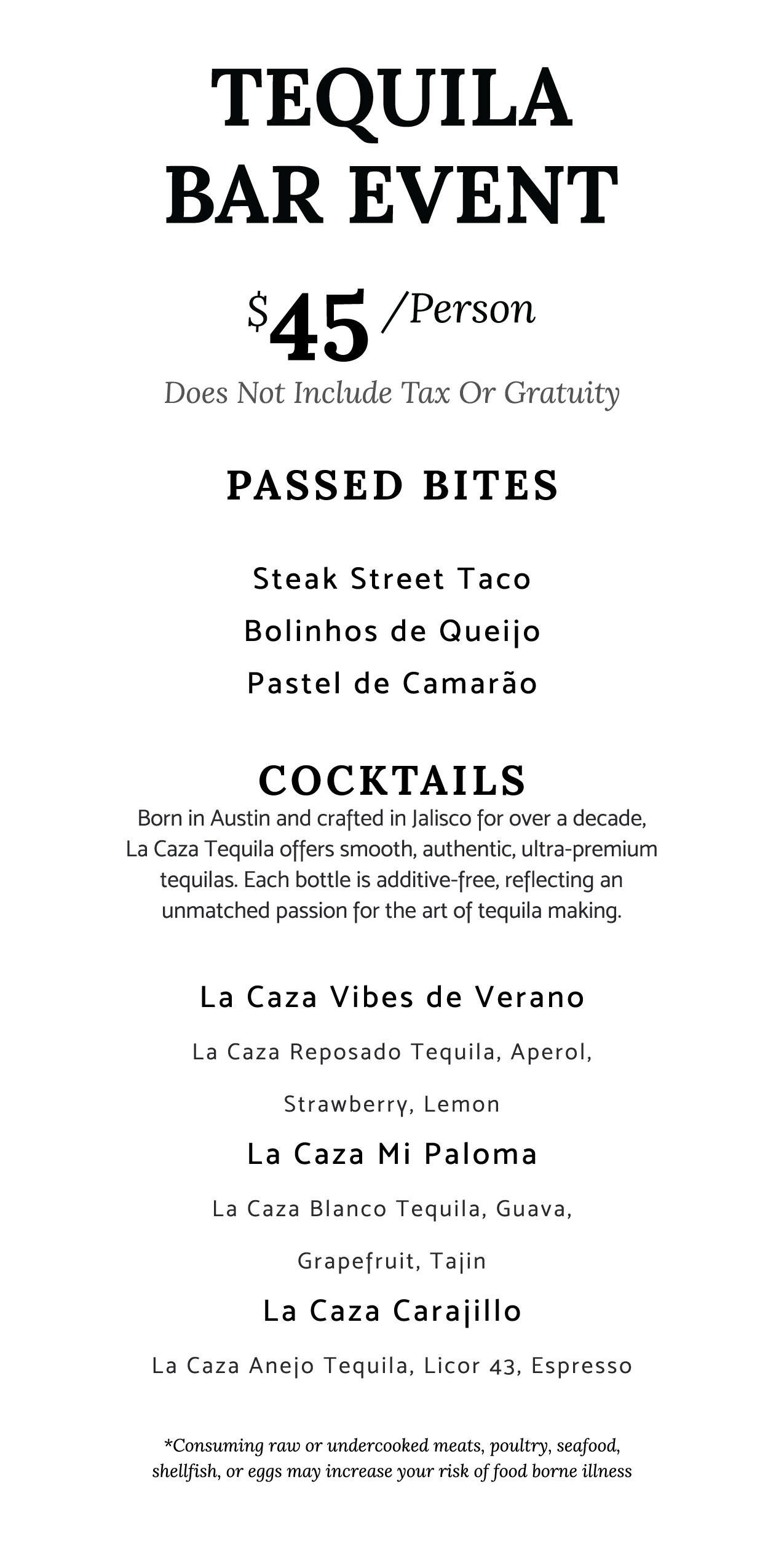 Join Casa do Brasil in College Station on September 24th for a special La Caza Tequila Bar event. Enjoy three handcrafted tequila cocktails with delicious bites including Steak Street Tacos, Bolinhos de Queijo, and Pastel de Camarão. Reserve your spot for this one-night-only $45 per person experience.