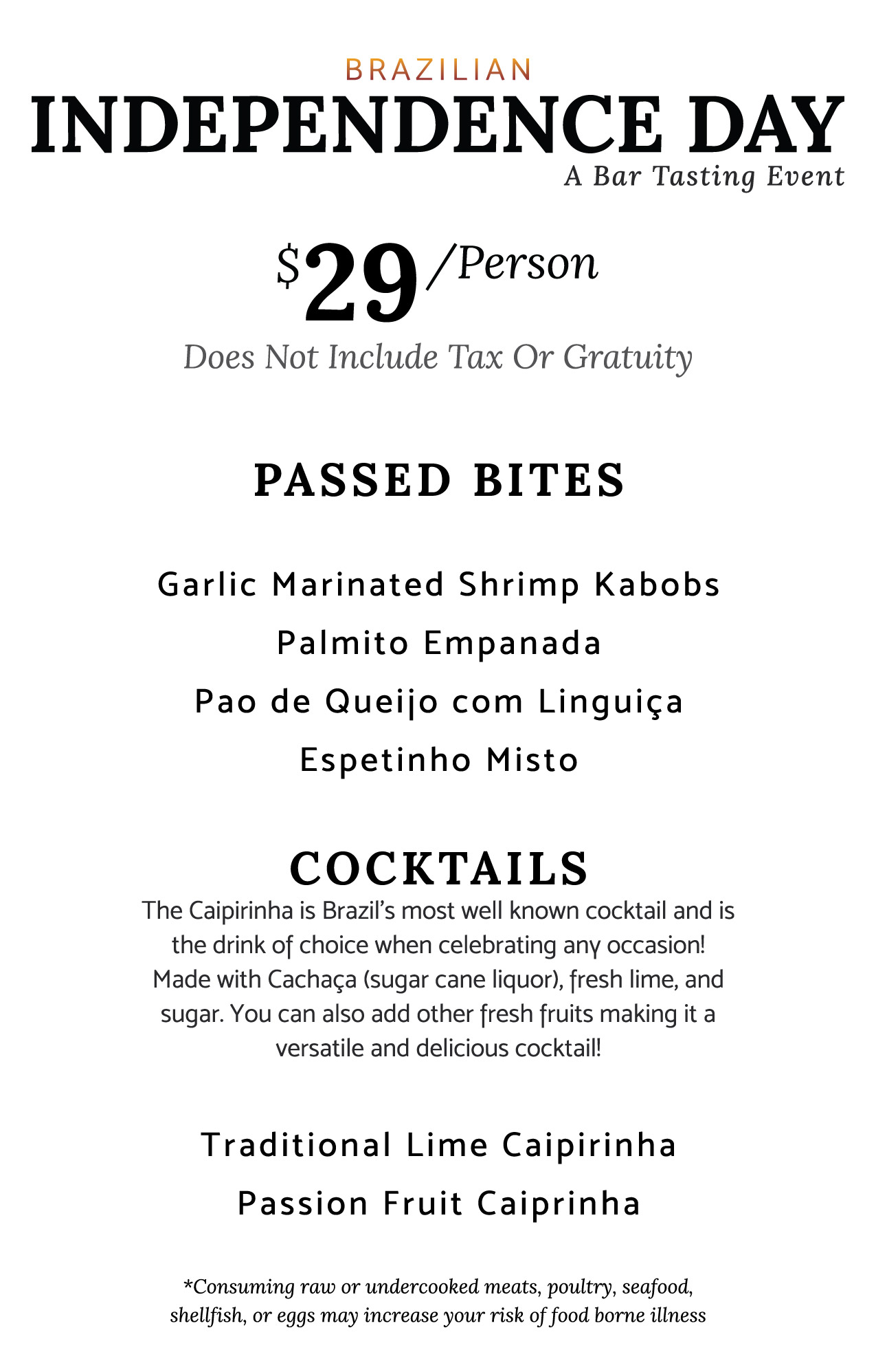 Join us on Saturday, September 6th at Casa do Brasil Brazilian Steakhouse for a festive Bar Tasting Event honoring Brazil’s Independence Day. Guests will enjoy a lively evening featuring passed bites crafted by our chefs and Brazil’s signature cocktail—the Caipirinha. Each ticket includes two Caipirinhas and savory appetizers for just $29 per person.