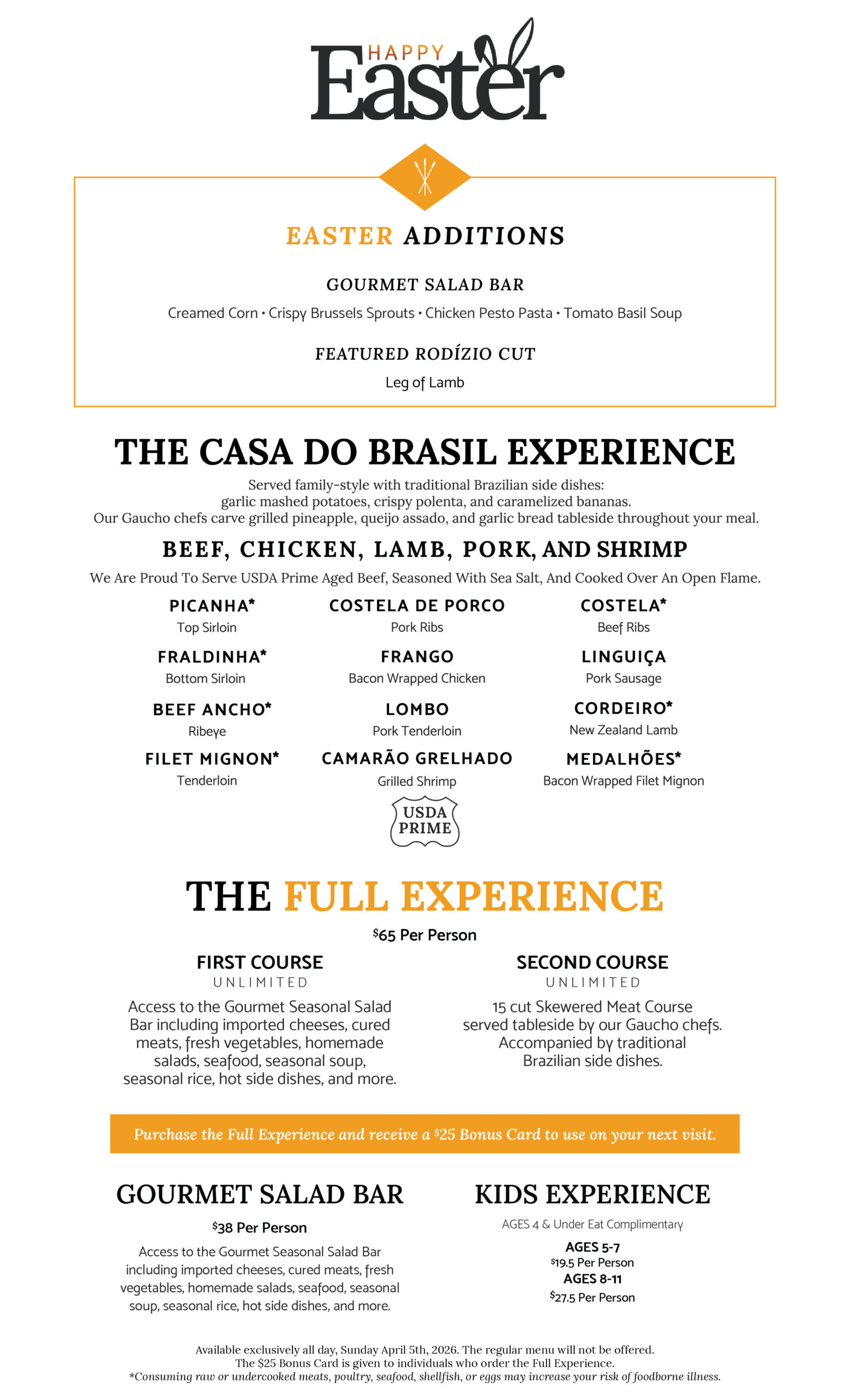 On Easter Sunday, gather your family and friends at Casa do Brasil College Station for an unforgettable Easter celebration — Brazilian churrasco style. From the moment our gauchos arrive at your table carrying our featured Leg of Lamb, to the last bite from our brunch salad bar, every moment is made perfect for your family.
