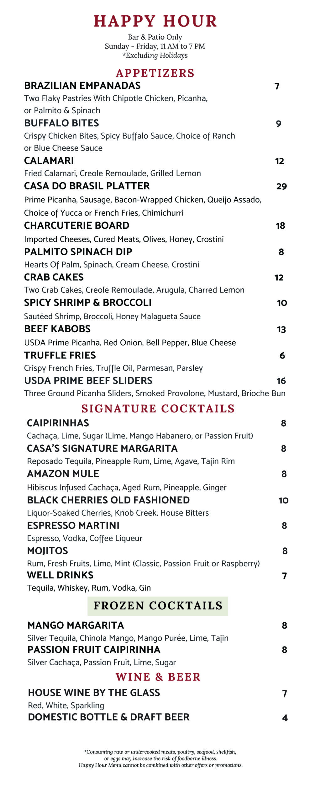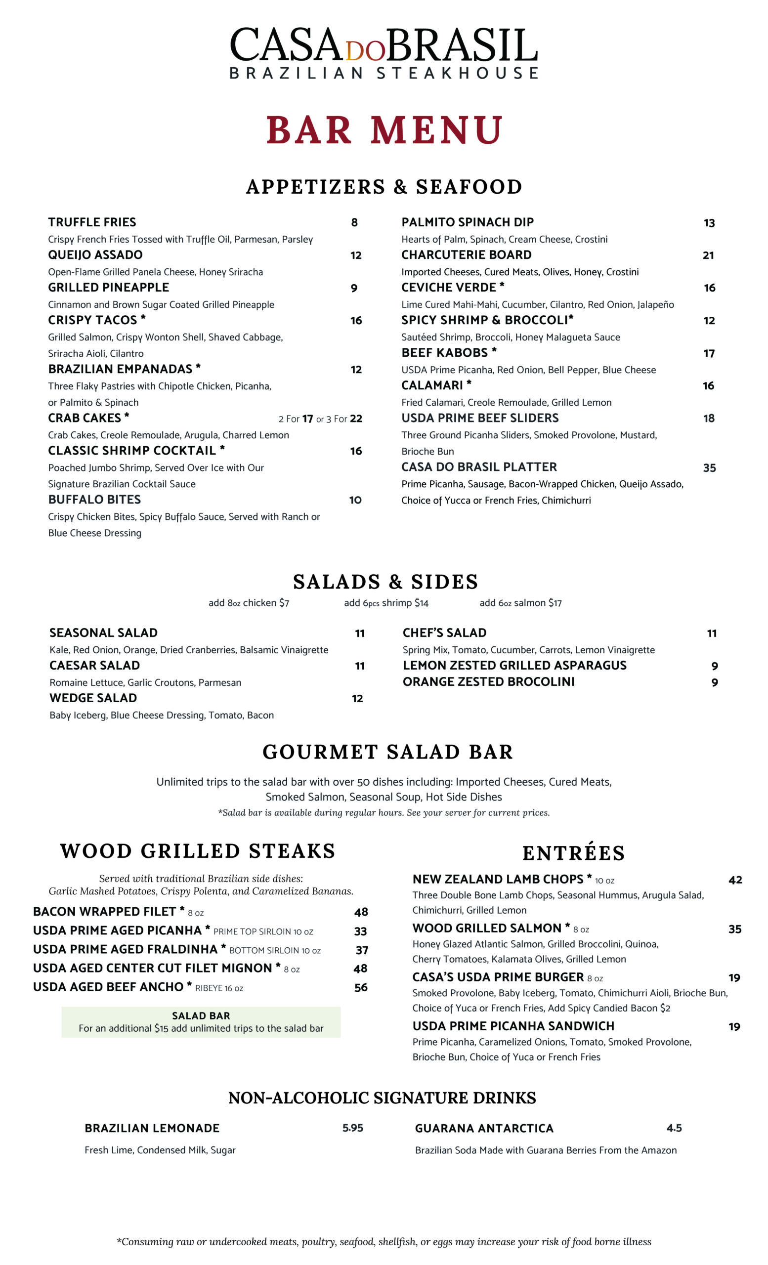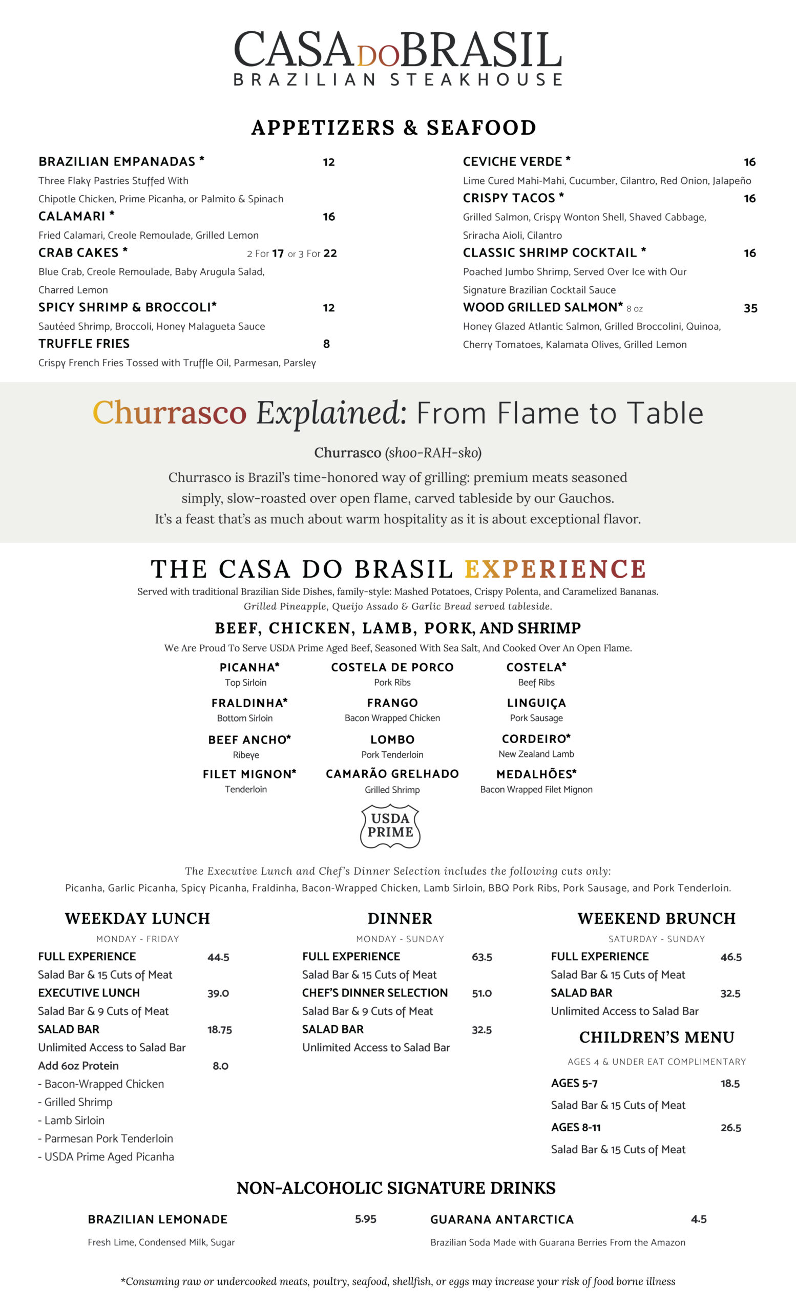 Unlimited dining on over 50 dishes, including homemade salads, cured meats, seafood, hot Brazilian Side Dishes, and more! Flip your coaster to green and add on eight cuts of skewered meat served tableside.