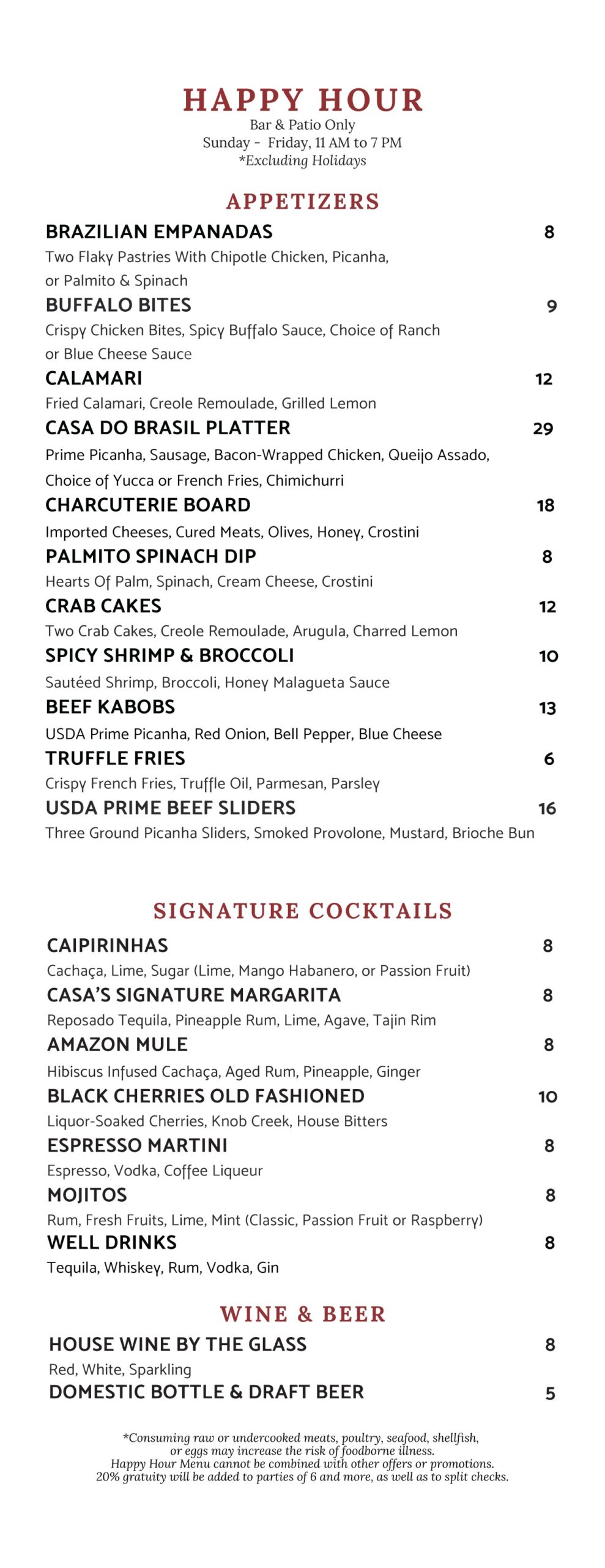 HOUSTON, TexasSee Meat GuideMain MenuLunch SpecialsHappy HourBar MenuAlcoholic BeveragesDessert VISIT US2800 Sage Rd. Suite A100, Houston, TX 77056CALL NOWJOIN CASA CLUBKeep Up With Us on Social Media