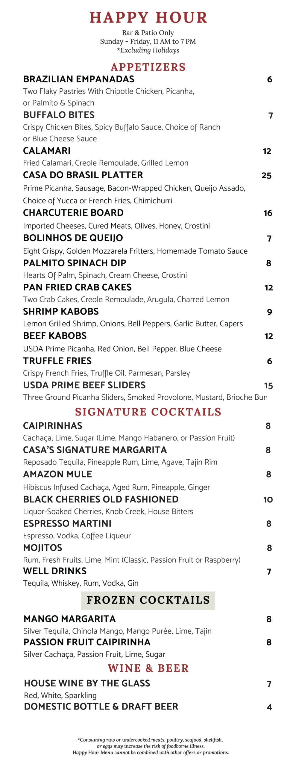Unwind in style during our Happy Hour, happening Sunday through Friday from 11am to 7pm at the bar and patio at Casa do Brasil Brazilian Steakhouse in Waco, Texas. Enjoy specially priced cocktails, wines, and select appetizers in a relaxed, upscale atmosphere perfect for midday breaks, after-work meetups, or weekend lounging.