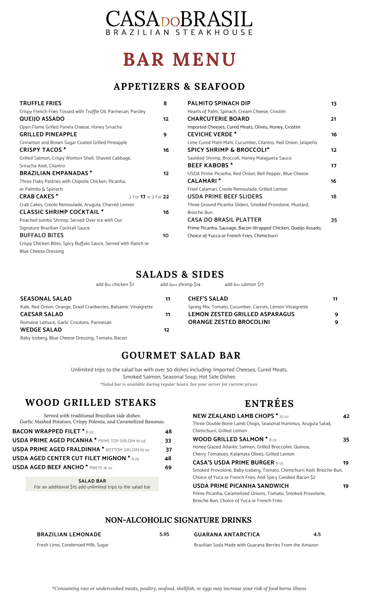 Our world-class salad bar features over 50 unique and delicious dishes, including; fresh vegetables, homemade salads, imported cheeses, cured meats, seafood, and soup. New dishes are added seasonally!