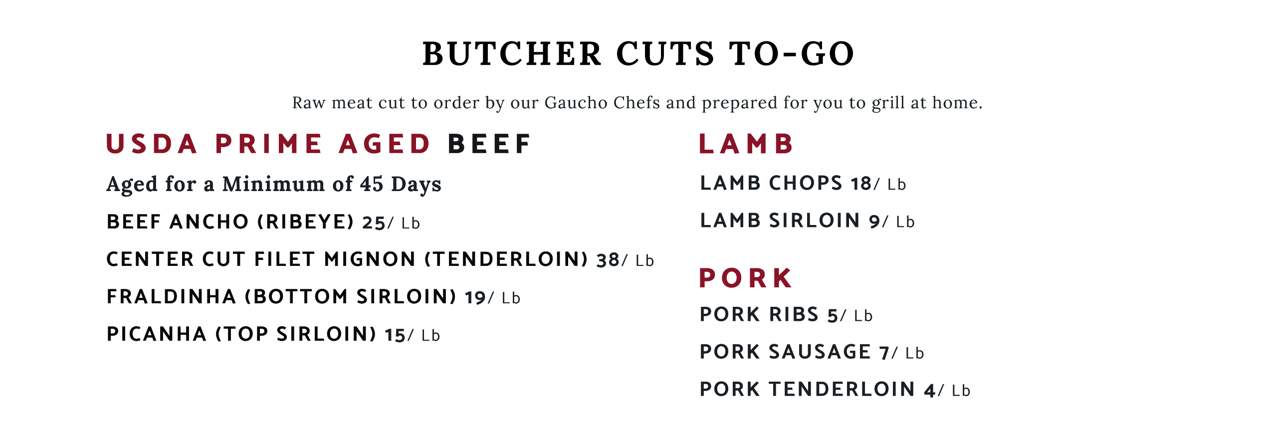 Served tableside by our Gaucho Chef's, indulge in USDA-Prime Aged beef, chicken, lamb, pork, and shrimp.